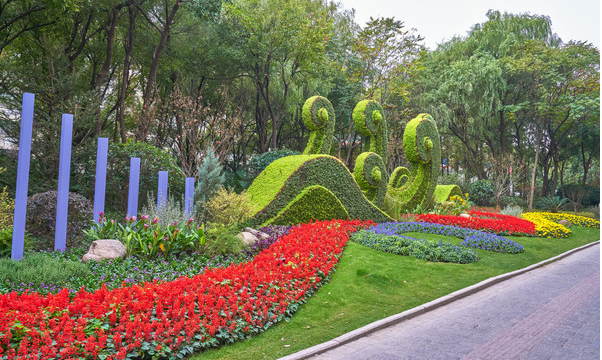 昨日,記者從市新城區(qū)城市管理局獲悉,轄區(qū)園林綠化部門在昆侖大道等主要道路節(jié)點(diǎn)綠地打造的44處城市綠雕景觀已經(jīng)全部完工,成為新城區(qū)新景觀。據(jù)介紹,這些城市綠雕使用彩色鮮花和色葉植物為材料,通過塑形、填裝、插栽等技術(shù),制作出不同主題的立體造型城市綠雕。 路邊綠雕成景觀 下午3時(shí)許,記者在昆侖大道一側(cè)的花壇上豎立一個四五米高的立體城市綠雕,整個雕塑用顏色各異的草花綠植拼成。如同圓月的造型上飄著朵朵祥云,其中一朵祥云組成傳統(tǒng)的如意造型,圓月中還有朵朵盛開的蓮花造型,旁邊一只用綠植組成大蝴蝶翩翩飛來。精巧的造型吸引了不少過往市民駐足觀看。而四流南路與開平路路口綠地中的綠雕作品則充滿童趣,一只兩米多高的卡通熊笑容可掬,身邊還放著一個盛滿瓜果蔬菜的大籃子。 為新城區(qū)環(huán)境又新添一抹新綠