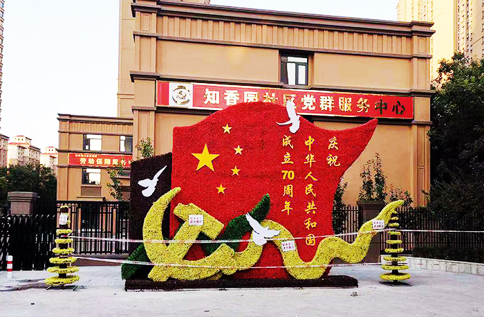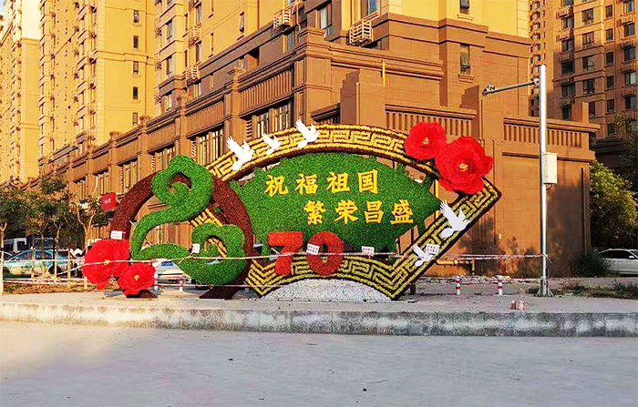 綠雕中包含紅旗、黨徽、和平鴿等核心元素,“慶祝中華人民共和國成立70周年”幾個大字赫然顯示在紅旗上,直接點明主題。其實每個組成元素都具有美好的寓意,整體除了表達(dá)對祖國生日的祝福,更傳達(dá)出對祖國為廣大人民群眾提供和平和諧的社會環(huán)境的感恩之情。整組造型高4米,寬5.5米,采用深綠、淺綠和紅色三種顏色的仿真材料組合而成,造型簡單大氣,寓意傳達(dá)明確。