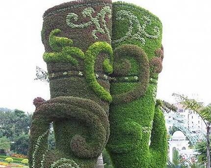 綠雕”被譽為世界園林藝術(shù)的奇葩,是一種有生命的植物雕塑。一般內(nèi)設(shè)鋼材構(gòu)架,然后在構(gòu)架上填充栽培土,再于其上種植一年生或多年生小灌木或草本植物,即采用掛泥插草或卡盆工藝把不同顏色的花草覆蓋在結(jié)構(gòu)造型的表面,巧妙地把雕塑造型與花卉園藝結(jié)合在一起,鋼架表面的植物覆蓋率至少要達到80%。因此,綠雕是充滿生機的“花卉雕塑”,是人類運用自然力量創(chuàng)造出的又一園藝文明。園區(qū)工作人員說,千萬不能小看這些細(xì)小的植物,它們在選擇上有很大的差異。一般都要求生長緩慢的、適應(yīng)性強、枝葉細(xì)小、植株緊密、色彩豐富又容易修剪的觀葉觀花植物。大多選用四季海棠、孔雀草等植株低矮、花小而密的品種。據(jù)介紹,西安世園會園區(qū)內(nèi)共規(guī)劃大、中、小型綠雕30多件,各類造型既奇特又美觀,有展示中華園林園藝文化的《玉樹臨風(fēng)》;體現(xiàn)陜西地域特色的《瑞兔迎賓》;還有表現(xiàn)手法大膽、有趣又頗具寓意的《鮮花霓裳》等,都體現(xiàn)了高超的園藝水準(zhǔn)。