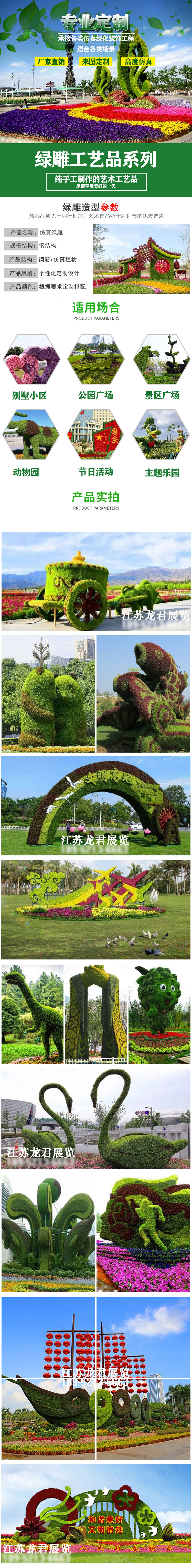 龍君稻草綠雕工藝品有限公司地理位置優越,交通尤為便利,是一家集研發、設計、生產、安裝于一體的廠家,主要產品有綠色景觀綠雕立體花壇、城市綠雕、園林綠雕、商業綠雕、仿真植物墻、仿真動物卡通造型、仿真草皮、卡通展、大型主題公園仿真工藝品、花雕、群雕、組雕、浮雕的整體規劃、稻草藝術景觀工程設計、稻草藝術節策劃制作等其它園林景觀產品。設計團隊由二十多年雕塑造型師帶隊,在設計上能夠大膽的構思創意別出心裁.雕塑上進益求精.制作上精工細磨,是國內一家擁有專業設計、制作和安裝服務的公司,公司尤其擅長園林、綠化、綠雕等各種雕塑工程。多年來從事稻草藝術景觀規劃設計取得了長足的發展,表現出專業設計水平和后期服務。至今已完成多個稻草藝術景觀工程設計、稻草藝術節策劃制作。公司秉承與時俱進、因地制宜的設計理念。把不同地域、民俗風格進行有機混合,巧妙處理用稻草與藝術的結合,給游客更多視覺的震撼.為您展現“人與自然和諧共處”的稻草景觀作品是我們始終不渝的追求。